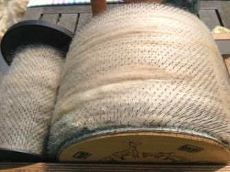 Wij hebben namelijk geen grote sterke professionele kaardenmolen, maar een lief klein handzaam molentje die heftig protesteert tegen de sterke krullen van deze mooie wol. Dus er is (nog meer) werk aan de winkel voordat wij met deze wol aan de slag kunnen.